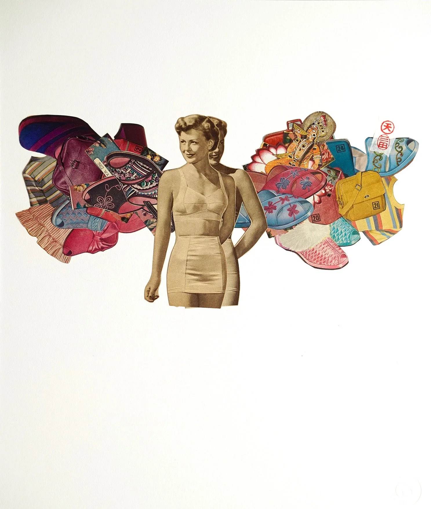 Women pulled from mid-century catalogs—housewives in swimsuits and slips—reborn as deities. Blythe cuts them free, layers them, gilds them with gold, watches them dissolve into something boundless.