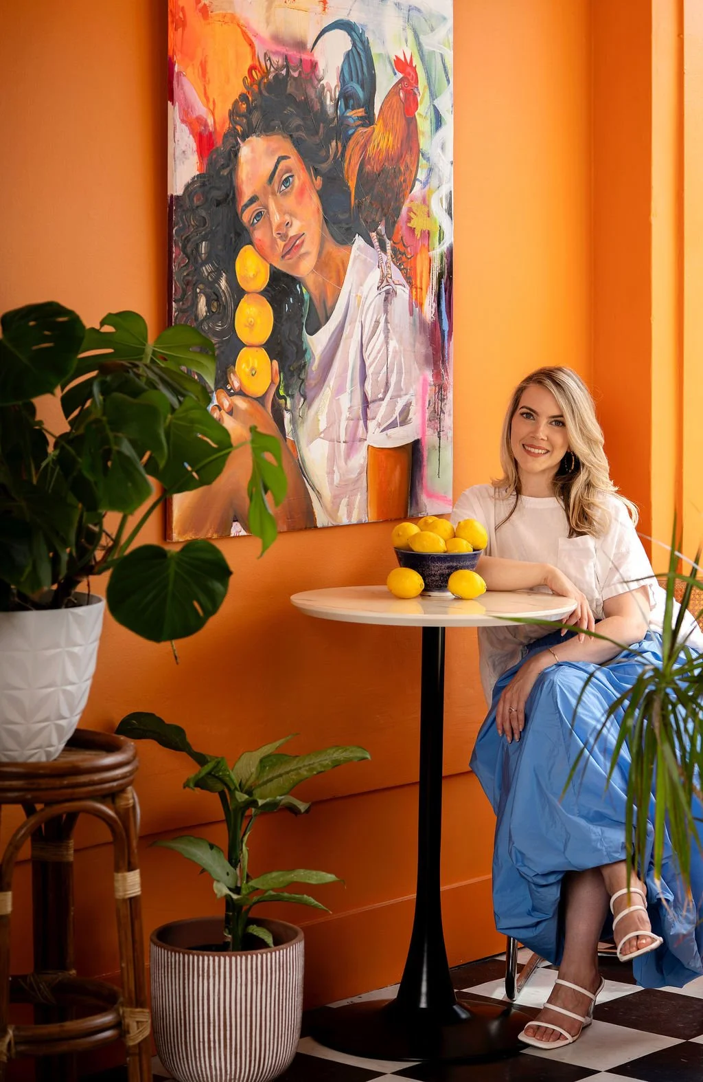Morir Soñando, named after the beloved Dominican drink of milk and orange, captures a moment suspended between work and rest. The figure stands beside a clothesline, arms full of bright oranges — as if she’s just decided to set the chores aside and savor something simple, something sweet.
